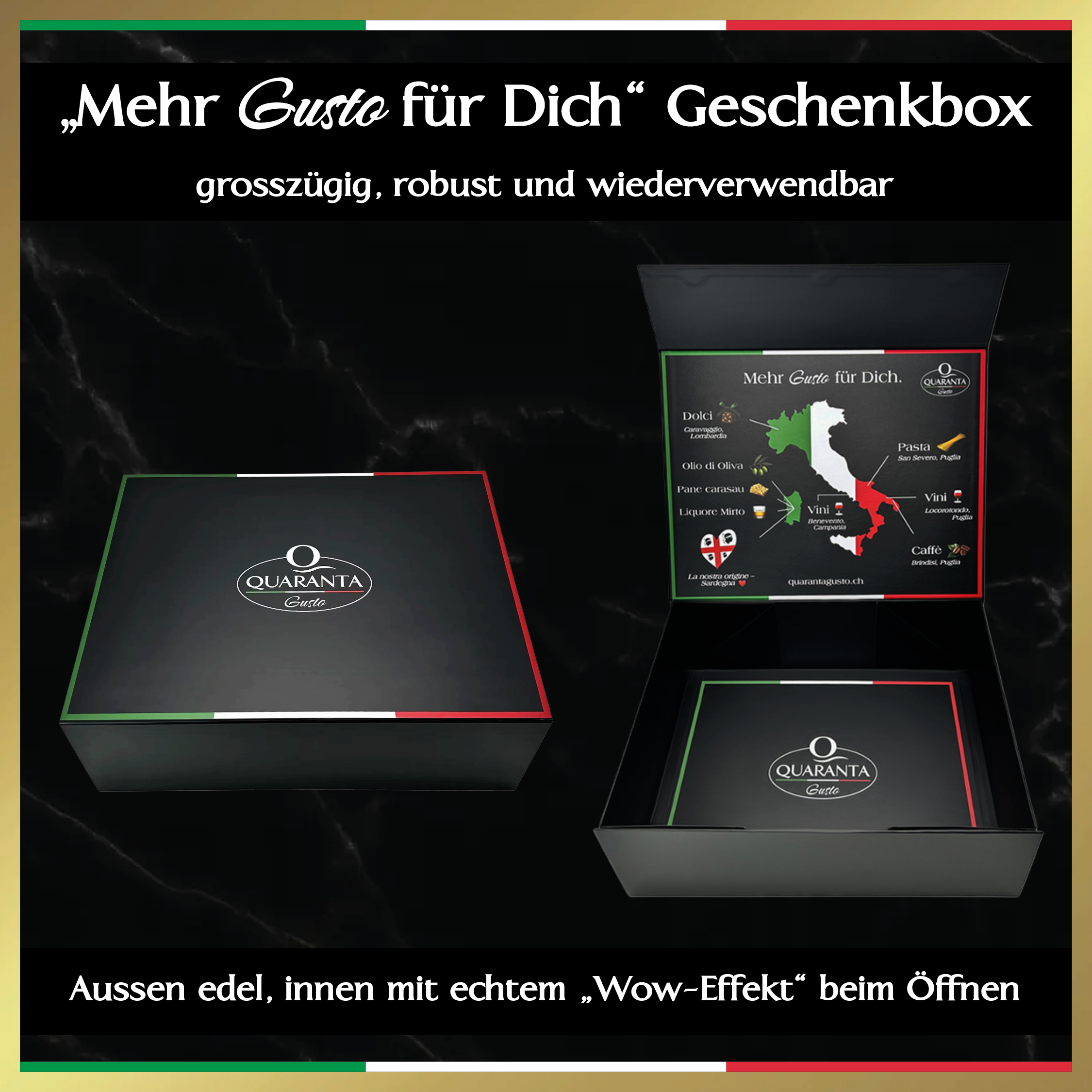 🇮🇹 Echt italienischer Genuss als Geschenkidee 🍷 Drei ausgewählte Santiquaranta Weine aus Kampanien ☕ Charaktervoller Quaranta Caffè aus Apulien 🌾 Handgemachte italienische Pasta 🎁 Optional in der „Mehr Gusto für Dich“ Geschenkbox ✨ Vorteilspreis: 16.00 CHF Ersparnis zum Einzelkauf